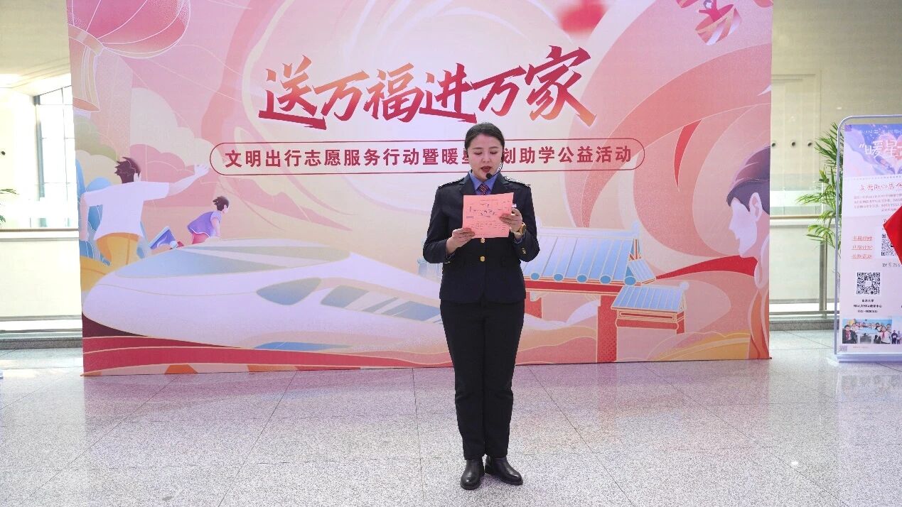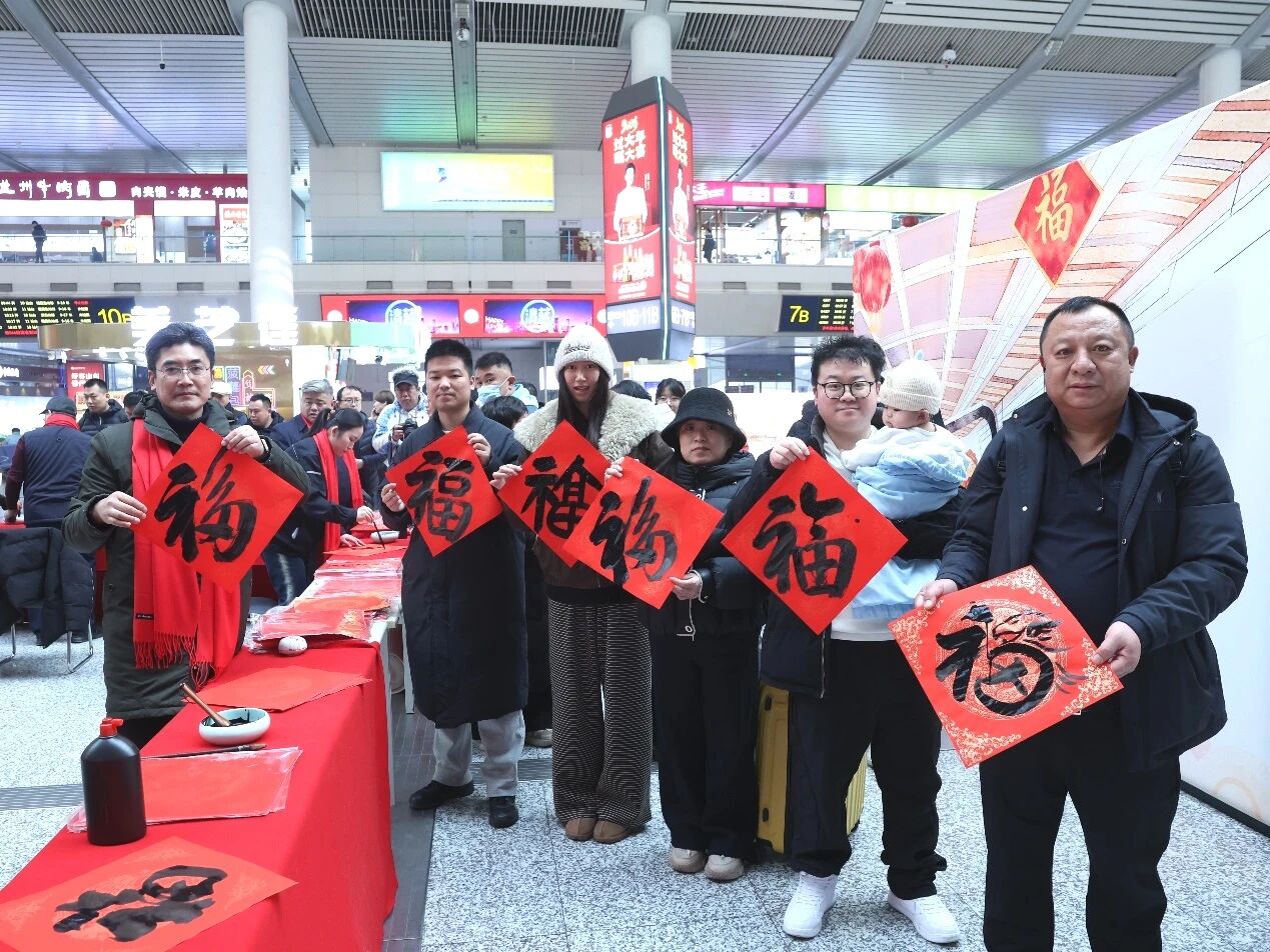 在济南西站,“送万福进万家万福迎春”志愿服务行动暨“我的铁路风景”主题宣传活动为归家旅客送上了文艺演出、笔墨送福及摄影展览。在《春节序曲》《回家》等经典音乐构成的春之序曲中,候车旅客充分感受新春喜悦和归乡情切。现场书法家挥毫泼墨,一副副寓意吉祥的春联、一个个饱满喜庆的“福”字送给旅客,墨香中传递着文化温情与旅途关怀。“我的铁路风景——温暖回家路”职工摄影作品展更是吸引了众多旅客驻足。